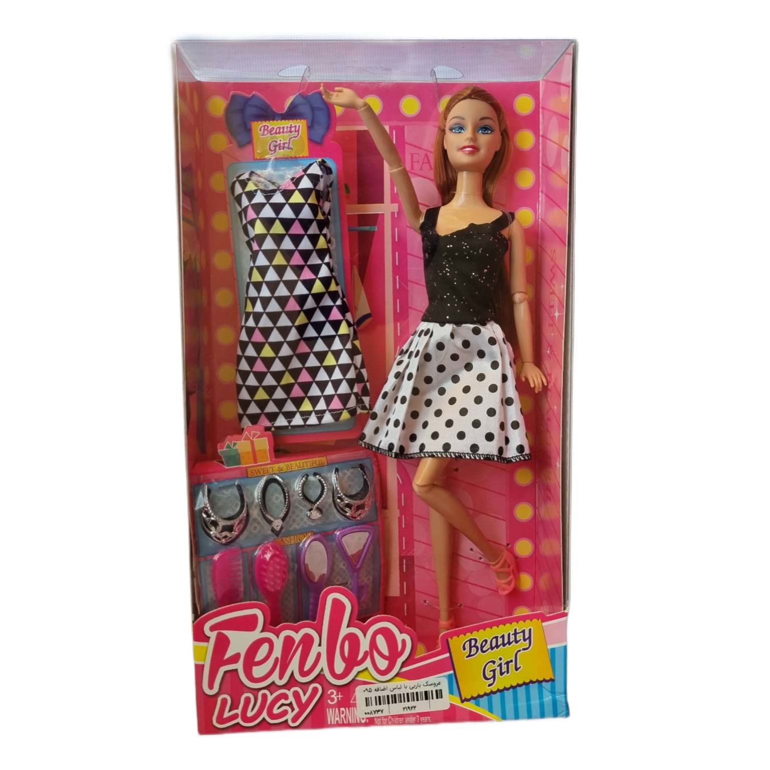 عروسک باربی Fenbo Lucy مفصلی ساخت چین، همراه با ست کامل اکسسوری (شانه، آینه، تاج و…) و لباس اضافه. کیفیت مناسب، ظاهر جذاب و قابلیت حرکت مفاصل برای ژستدهی و بازی تخیلی. انتخاب عالی برای هدیه و سرگرمی کودکان.